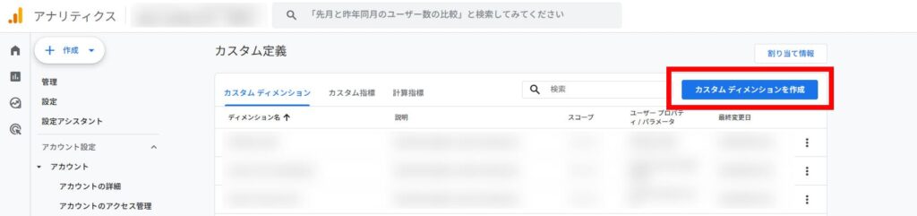 GTMでパラメータを送信したら、GA4の管理画面でカスタムディメンションを登録します。「管理」→「カスタム定義」→「カスタムディメンションを作成」と進み、イベントスコープを選択して名前・パラメータを入力します。