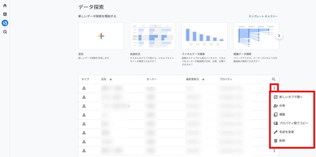 完成した探索レポートは、右上の「保存」ボタンから保存できます。チームで分析を共有する場合は、「共有」→「リンクをコピー」で同一プロパティ内のユーザーとレポートを共有可能です。また、「複製」を使えば別パターンの分析を効率的に作成できます。定例レポートや社内資料として活用する際に便利な機能です。