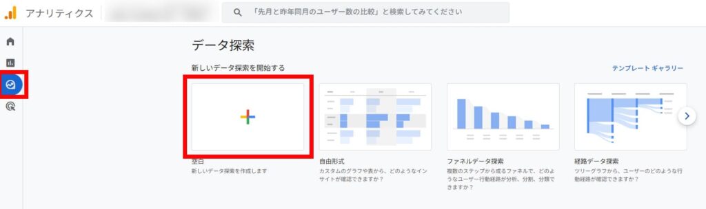 GA4の「探索(Explore)」を使うと、カスタムディメンションを自由に組み合わせた分析ができます。左メニューから「探索」を選び、「空白」テンプレートを開いてください。そこにディメンションや指標を追加してレポートを構築します。テンプレート形式ではなく、自社データに合わせて柔軟に設計できるのが特徴です。
