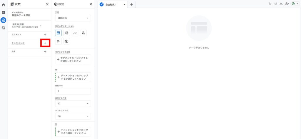 レポート画面の左パネルから「ディメンションを追加」し、次に「指標を追加」を選択します。「行」「列」「値」エリアにドラッグ&ドロップすることで、データの構成を自由に変更できます。たとえば「ユーザーランク(ディメンション)」×「購入金額(指標)」のように設定すれば、会員層ごとの成果が一目で把握できます。