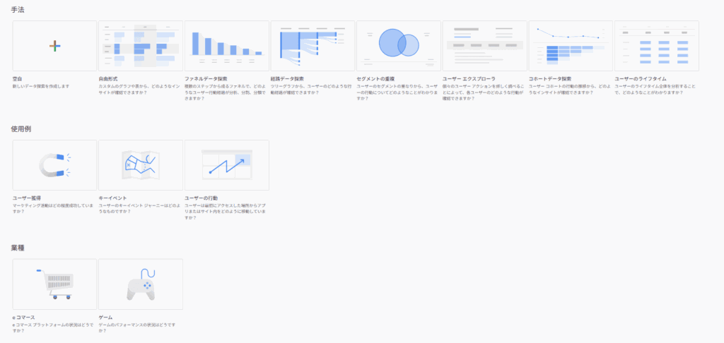 代表的なのが「探索(Exploration)」レポートで、自由に軸や指標を組み合わせて深掘り分析が可能です。ファネル分析や経路探索などもこの機能で行えます。