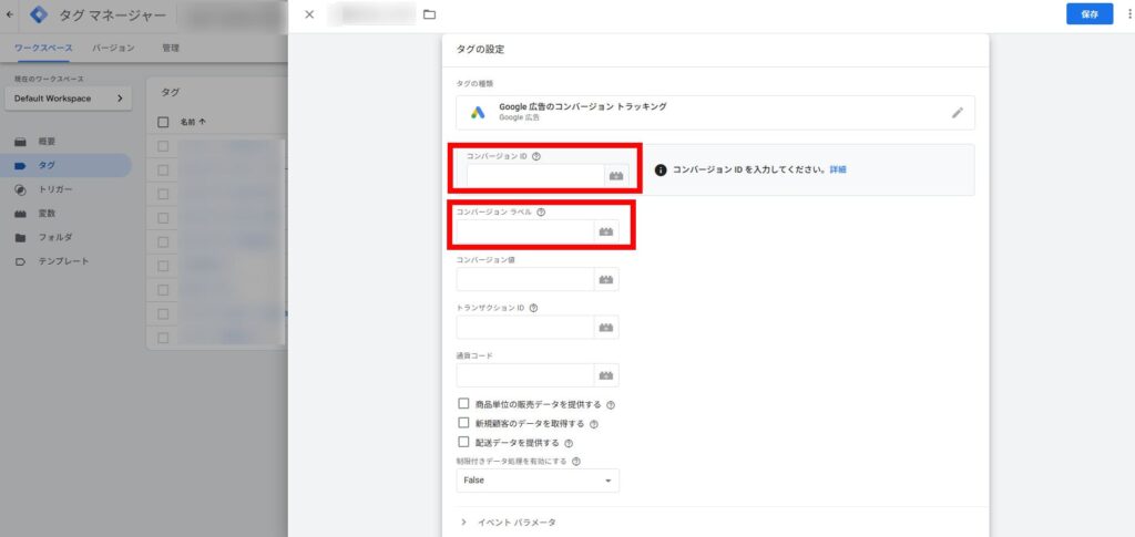 3. Google広告の管理画面で確認した「コンバージョンID」と「コンバージョンラベル」を入力