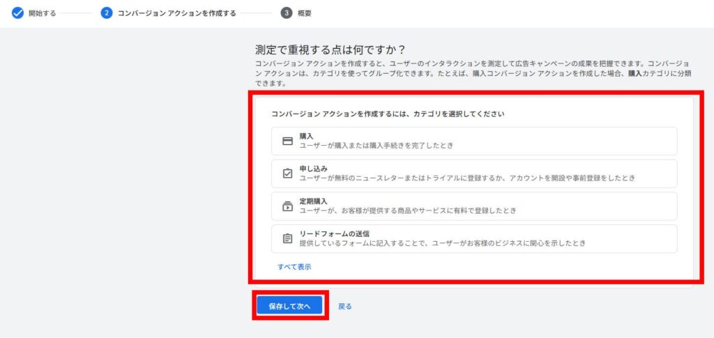 コンバージョンカテゴリ(購入・登録・問い合わせなど)を指定し、コンバージョン名/値/カウント方法/アトリビューションモデルを順に設定しましょう。