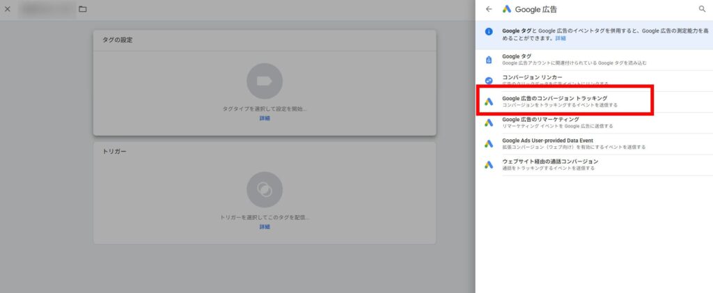 2. タグタイプで「Google広告のコンバージョントラッキング」を選択
