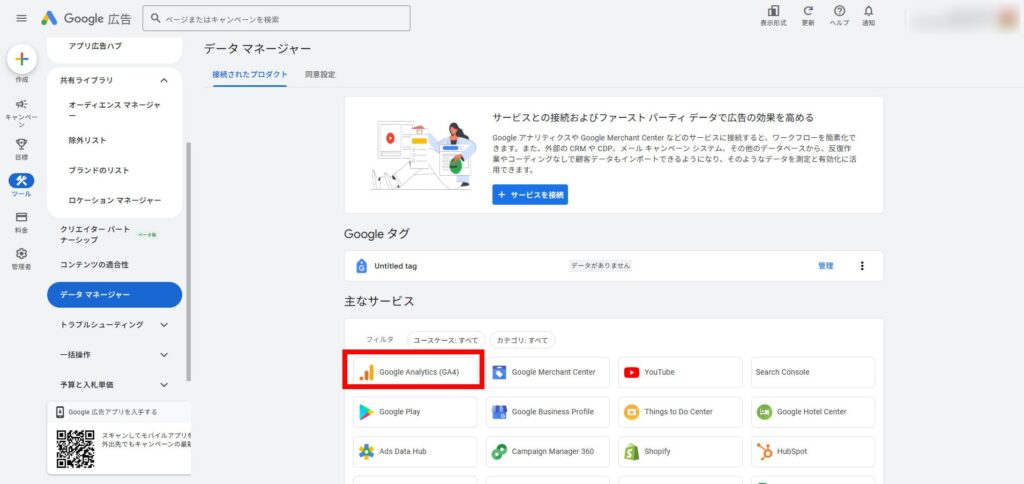 1. Google広告管理画面で「ツール」→「データマネージャー」を開く