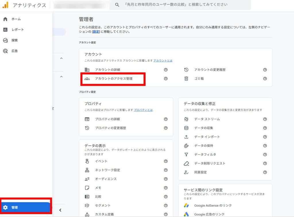 「管理」→「アカウントアクセス管理」→「+」ボタン→メールアドレスを入力し、「閲覧者」または「分析者」権限を付与してください。権限がない場合、API実行時にPermission deniedエラーが出ます。GA4とGCPの連携が成立して初めてデータ取得が可能になります。