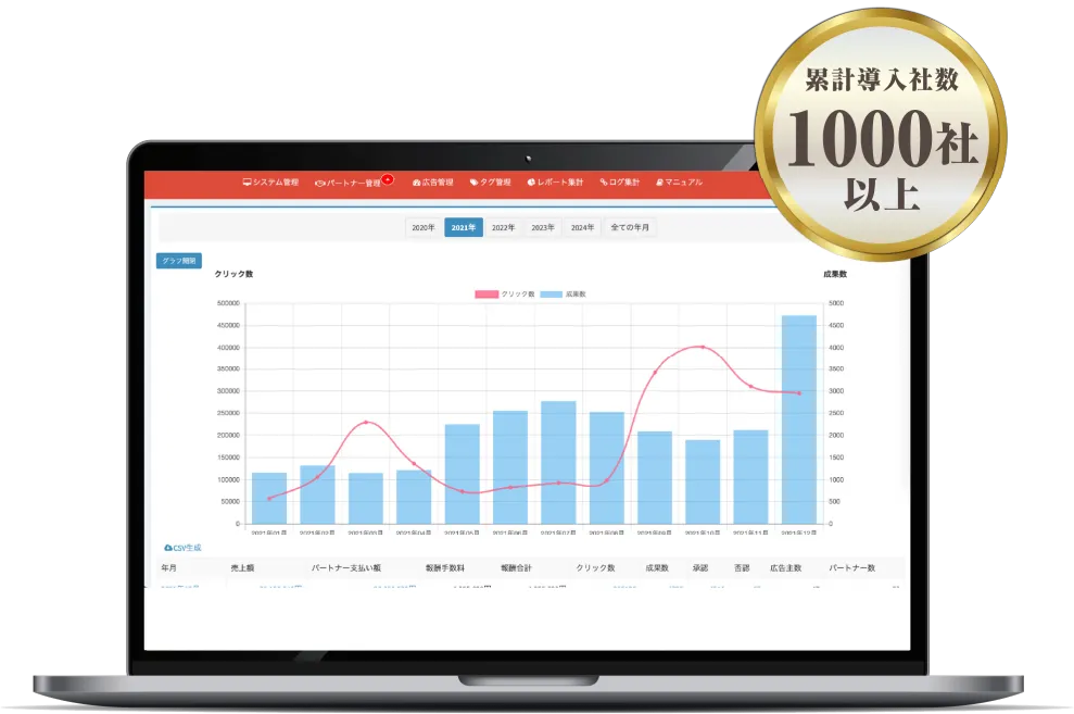 アフィリエイトシステムとは、アフィリエイトの仕組みを成立させるために必要なシステムのことをいいます。アフィリエイトを成立させるためには、表示回数・クリック数・コンバージョン数(CV数)等の成果情報を、広告主・アフィリエイトサイトが偽ることができない仕組みとして提供することが不可欠です。